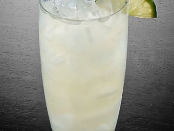 A shot of Nikka Vodka, soda, and Midori melon liqueur over ice. Garnished with lime.